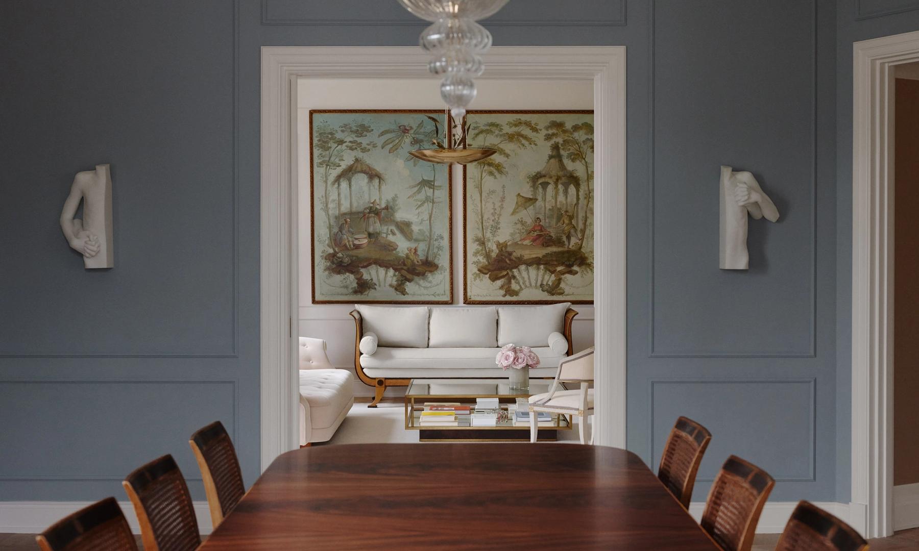 To optimize this elegant city apartment, Studio Ramson redesigned the floorplan to create a natural flow between the rooms whilst creating space for bespoke furniture and book shelves. The mix of antiques, layered textiles in strong patterns, and soft colours in hues of dove blue and soft pink, created a fresh and inviting space with a harmonious connection throughout the apartment. The textile-covered walls add a sophistication of warmth, elevating the overall aesthetic.